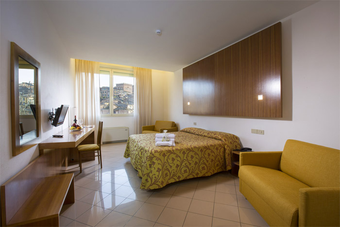 Elegant Standard | 2-3 persone | Camera di categoria media, più ampia della Economy. Letto matrimoniale spazioso (o twin su richiesta), possibile aggiunta di un terzo letto per un bambino. Arredamento moderno con dettagli classici (testata in legno intarsiato, tappeto colorato). Molta luce naturale, alcune con vista su scorci di Siena. Bagno comodo, in alcune stanze con vasca da bagno. | €80-€130 circa in bassa stagione; fino a €150 in alta stagione (stima) |