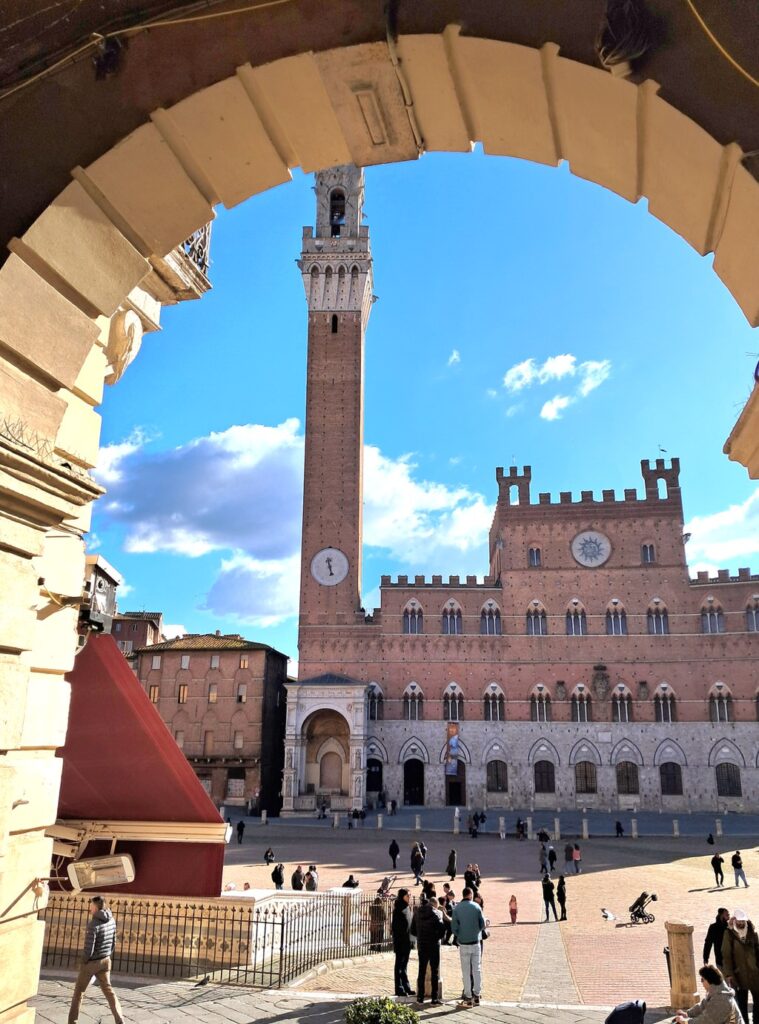- Museo Civico di Siena (nel Palazzo Pubblico) – All’interno del gotico Palazzo Pubblico, che domina Piazza del Campo con la sua Torre del Mangia, si trova il Museo Civico, tappa imperdibile per comprendere la storia e l’arte senese. Varcando la soglia del palazzo comunale ti troverai in sale affrescate che parlano di epoche lontane: la più famosa è la Sala dei Nove, dove campeggia il ciclo allegorico del Buon Governo e Cattivo Governo di Ambrogio Lorenzetti (1338-39), un capolavoro assoluto dell’arte medievale. Nella Sala del Mappamondo potrai ammirare la Maestà di Simone Martini, altro affresco emblematico del Trecento senese. Condividere la meraviglia di questi tesori artistici con la persona che ami rende la visita ancora più speciale. Come arrivare: il Museo Civico si trova in Piazza del Campo, quindi ~15 minuti a piedi dall’hotel (vedi percorso per Piazza del Campo). L’ingresso del museo è sotto i portici del Palazzo Pubblico. Da non perdere: la salita alla Torre del Mangia (alta 87 m) adiacente – sono circa 400 scalini impegnativi, ma la vista dalla cima ripaga di ogni sforzo. Salire insieme fino in vetta e abbracciarsi con Siena stesa sotto di voi è un’esperienza da batticuore!